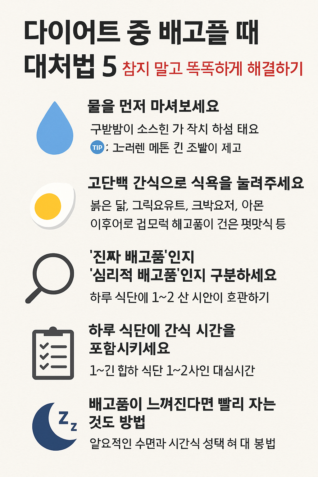 다이어트 중 배고플 때 대처법 5가지 – 참지 말고 똑똑하게 해결하기