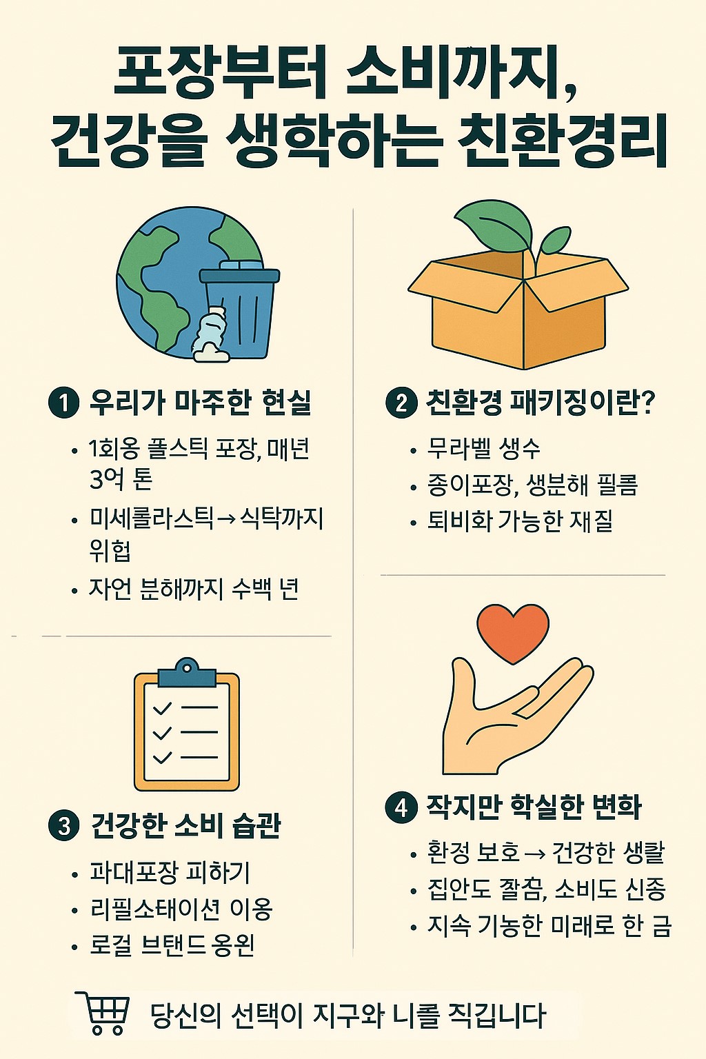 포장은 언젠가 버려질 운명이지만, 우리의 선택은 오래 남습니다. 오늘 내가 고른 제품이, 지구를 위한 한 걸음이 되고, 내 건강을 위한 실천이 된다면 그보다 멋진 소비가 또 있을까요?