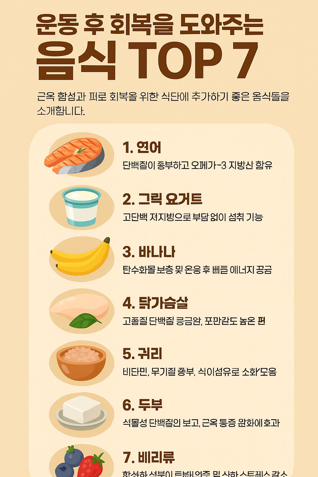 운동 후 회복을 도와주는 음식 TOP 7 – 근육 합성과 피로 회복을 위한 식단