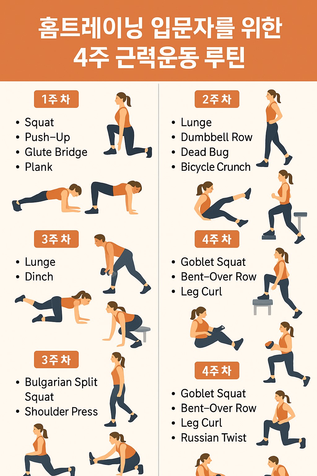 아래는 입문자를 위한 4주간 홈트 루틴입니다. 주 4일, 하루 20~30분 정도 소요되며 점차 강도를 높여가도록 설계되어 있습니다.
