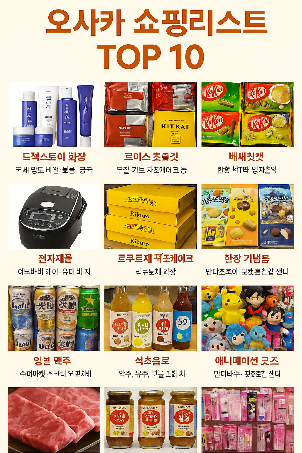 일본 오사카 여행에서 절대 놓치면 안 되는 쇼핑 아이템들을 소개합니다. 드럭스토어 꿀템부터 전자제품, 선물용 기념품까지, 현지인과 여행자 모두 추천하는 리스트를 정리했어요.