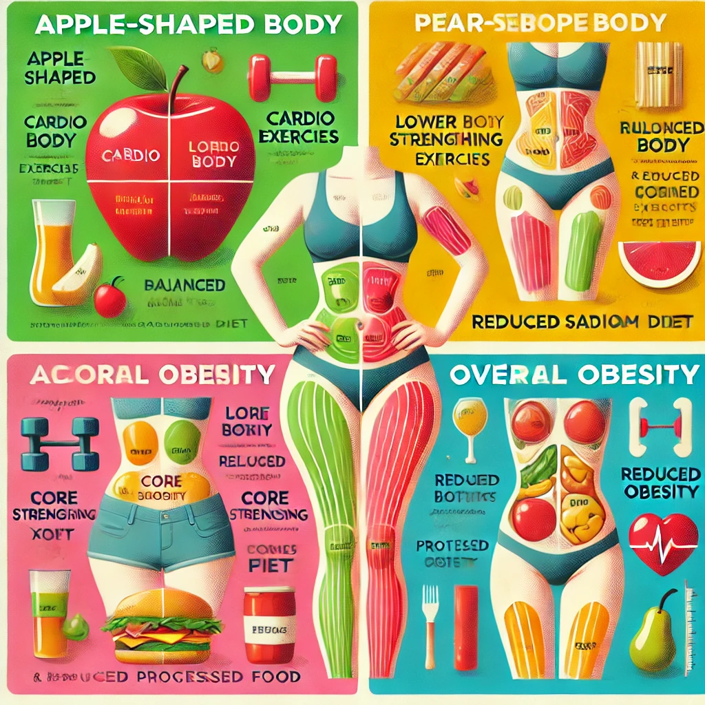 특징: 복부와 상체에 지방이 집중적으로 축적되며, 내장 지방 비율이 높은 경우가 많음.
